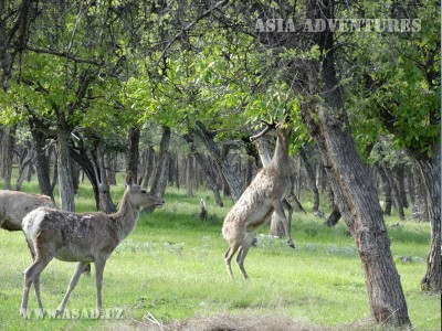 Mammals are represented by 24 species in the territory of the Zeravshan Reserve, among which are the tamarisk gerbil (Meriones tamariscinus), Erinaceus auritus, tolai hare (Lepus tolai), jackal (Canis aureus), fox (Vulpes vulpes), porcupine (Hystrix leucura), badger (Meles meles), Felis libyca and muskrat (Ondatra zibethica). In November 2005 a wild boar was encountered in the reserve. The animal is supposed to have come from the Zeravshan Range, from a territory adjoining Tajikistan. Since 1996 the programme ‘Restoration and Conservation of the Bactrian Deer Population’ has been carried out in the reserve. The programme is financed by the National Centre for Scientific Research (France), the International Association for the Promotion of Co-operation with Scientists (INTAS), the MacArthur Foundation, the Logistics Health Incorporated and the World Wildlife Fund (WWF).
